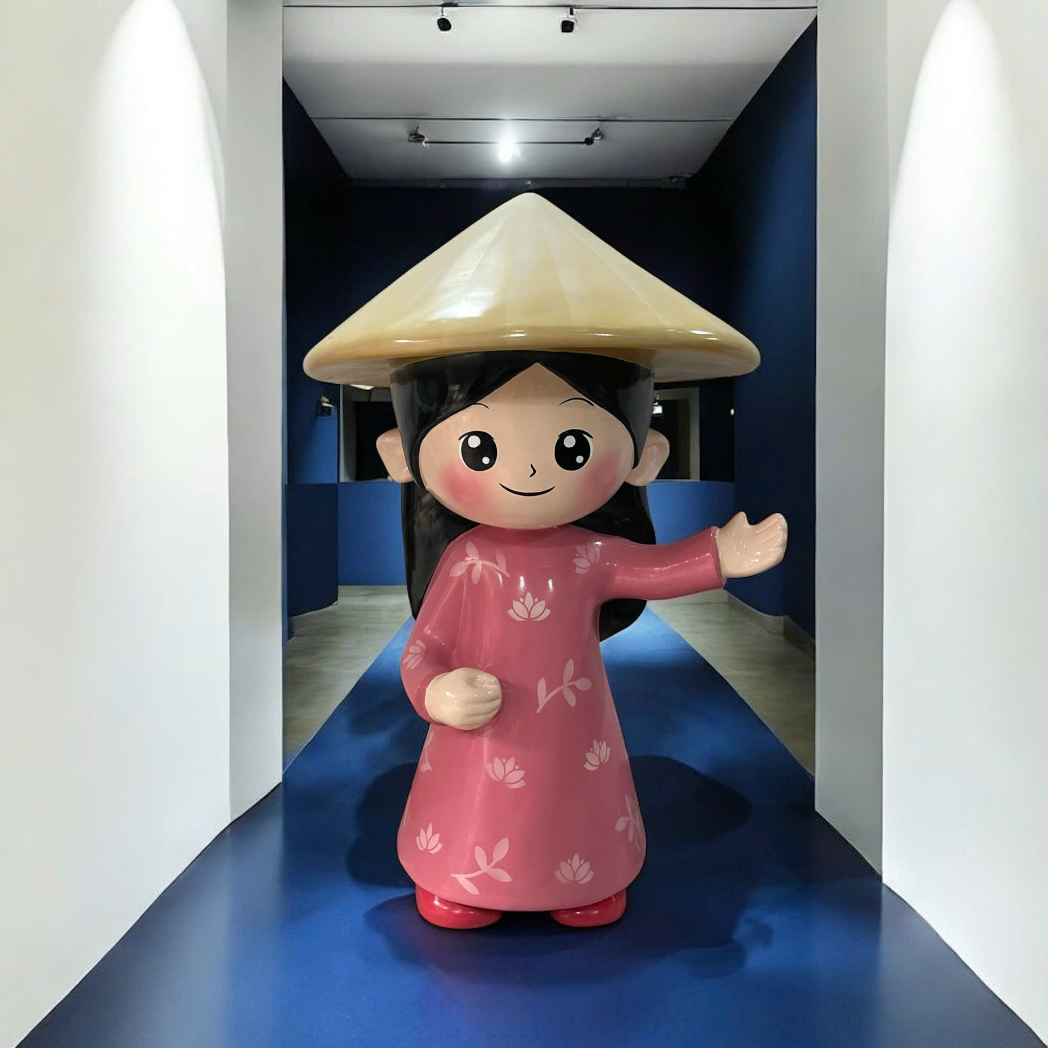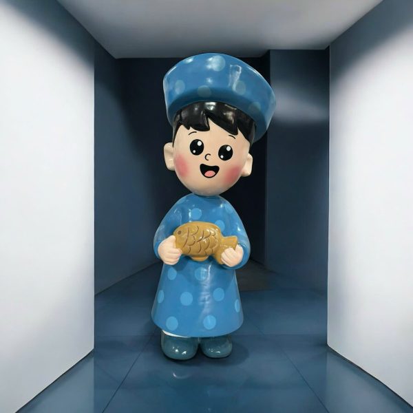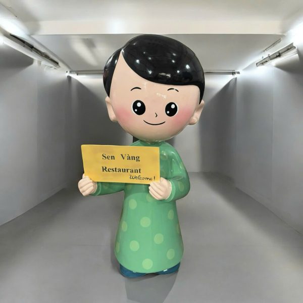 Tượng người làm từ nhựa composite gia cường sợi thủy tinh, bề mặt sơn bóng 2K/PU chống trầy, bền màu, chịu thời tiết tốt. Thiết kế dáng đứng thân thiện, phù hợp trưng bày trong nhà và ngoài trời, tạo điểm nhấn thu hút ở khu check-in, sảnh đón khách, trung tâm thương mại, quán cà phê, nhà hàng, khu vui chơi.